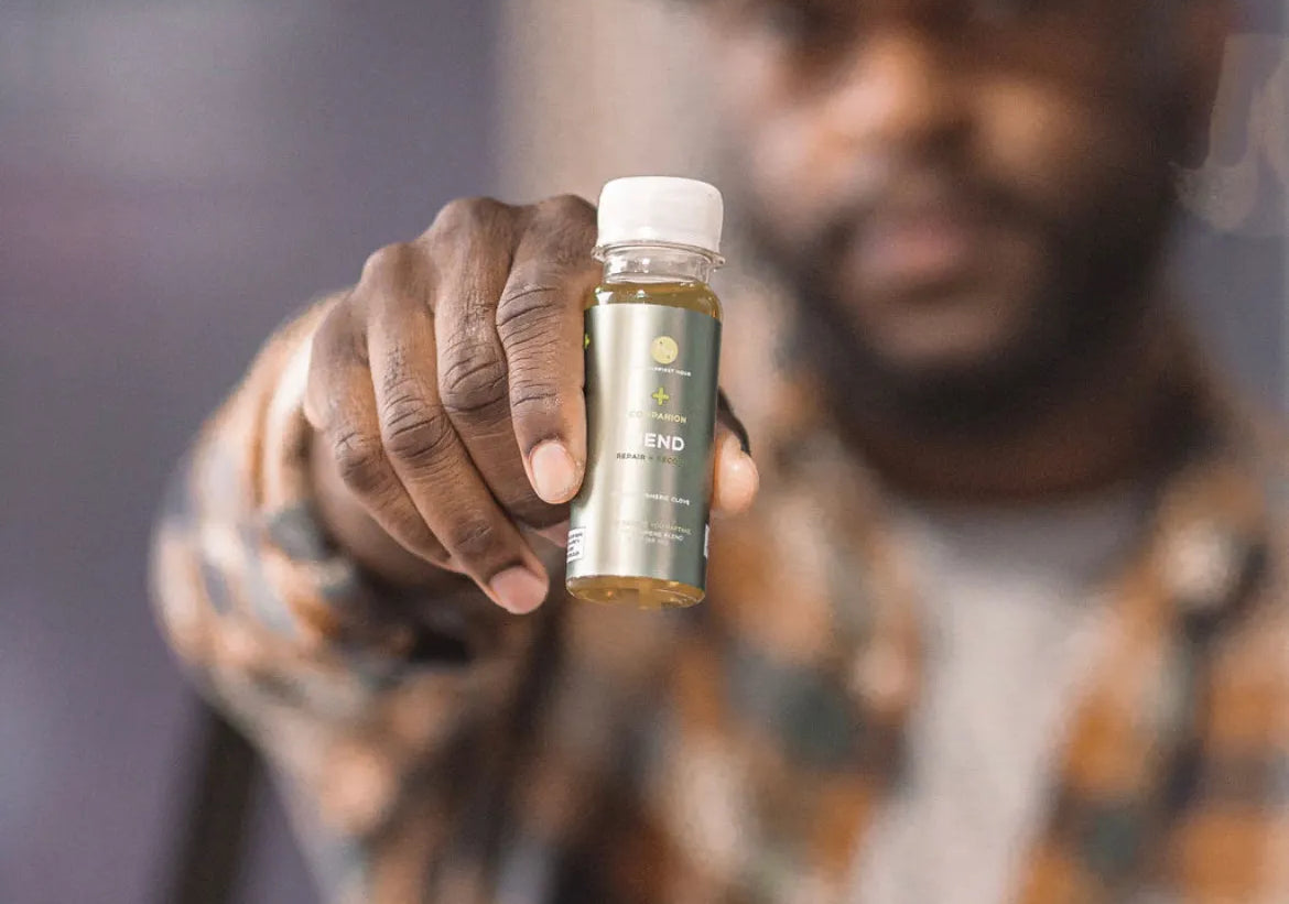 Naše směs Mend je vaším léčivým přítelem. Zázvor, kurkuma a hřebíček jsou naplněny uklidňující směsí terpenů, které podporují vás a vaše zotavení. Limonen pomáhá zmírnit bolest a zlepšit náladu. Karyofylen je jediný terpen, o kterém je známo, že působí také jako kanabinoid, který může aktivovat váš endokanabinoidní systém a poskytovat protizánětlivé účinky. Alfa-pinen pomáhá zvýšit bdělost a může pomoci snížit zánět. Myrcen interaguje s hematoencefalickou bariérou, což může pomoci zvýšit účinnost kanabinoidů, jako je CBD. Může vám také pomoci uvolnit svaly, abyste se cítili dobře.